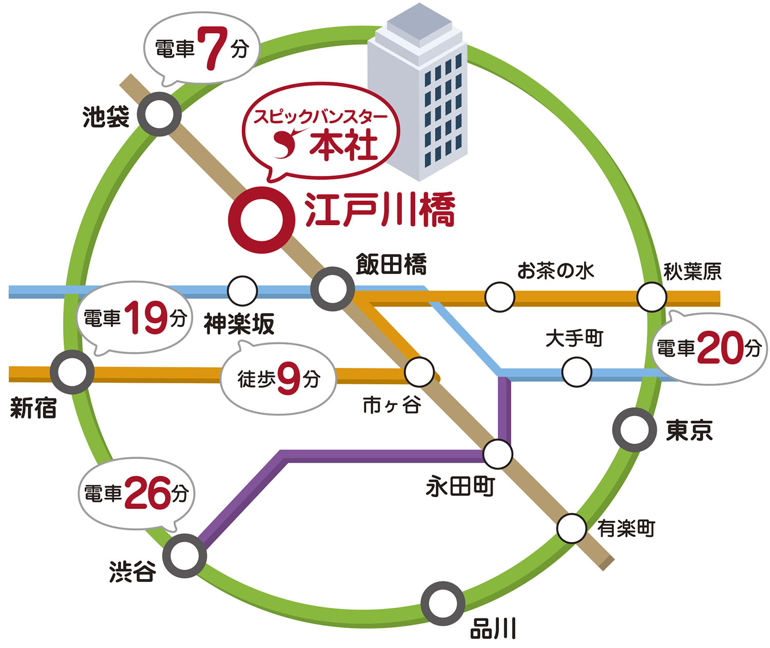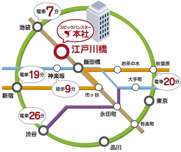 - 神楽坂9分(徒歩)・池袋7分(電車)・新宿19分(電車)・秋葉原20分(電車)・渋谷26分(電車)の好立地に本社ビルがあります。